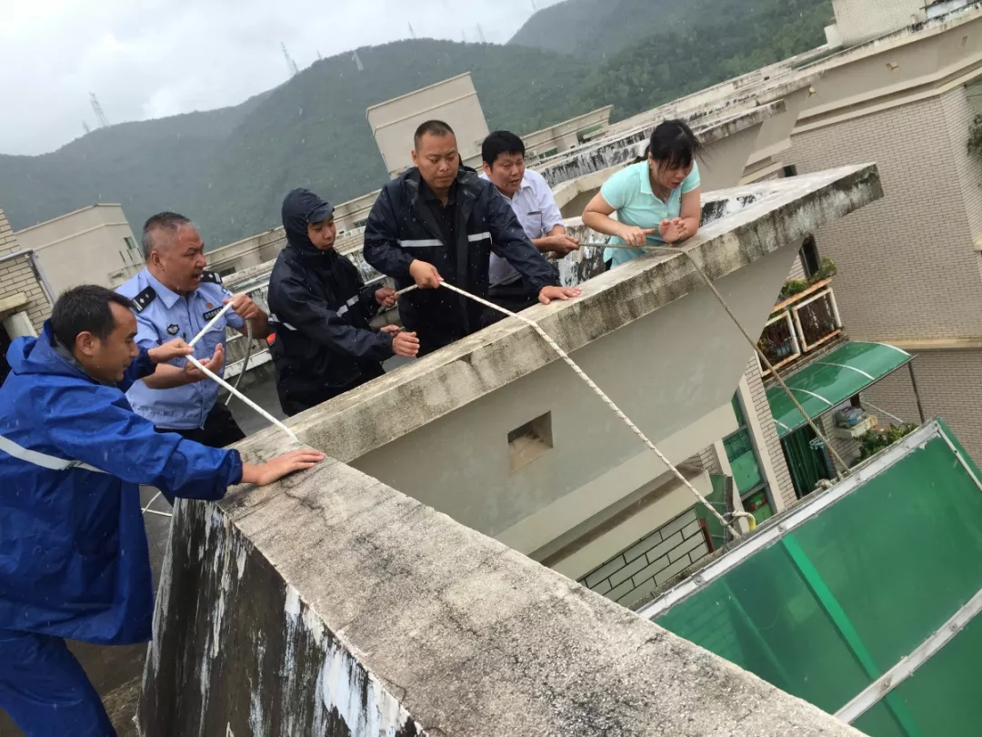 ▲2017年8月23日中午,在福田區(qū)梅林一村88棟,一家住戶的靠墻陽臺頂蓬固定支撐點(diǎn)已全部脫落,導(dǎo)致整個(gè)頂蓬向外傾斜,十分危險(xiǎn),福田公安分局梅林派出所民警聯(lián)合社區(qū)居民一起現(xiàn)場處置。