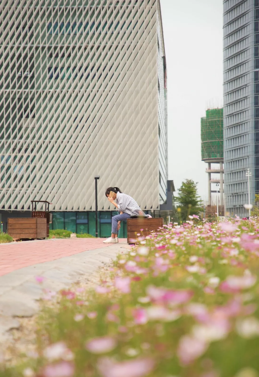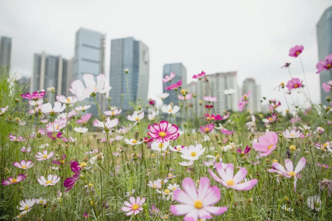 從寶安圖書館步行數(shù)十步,便是一大片浪漫的花海。風(fēng)從不遠(yuǎn)處的海面吹來(lái),那些隨風(fēng)起舞的白色、黃色、紫色、紅色、粉色的小花,就是秋英。