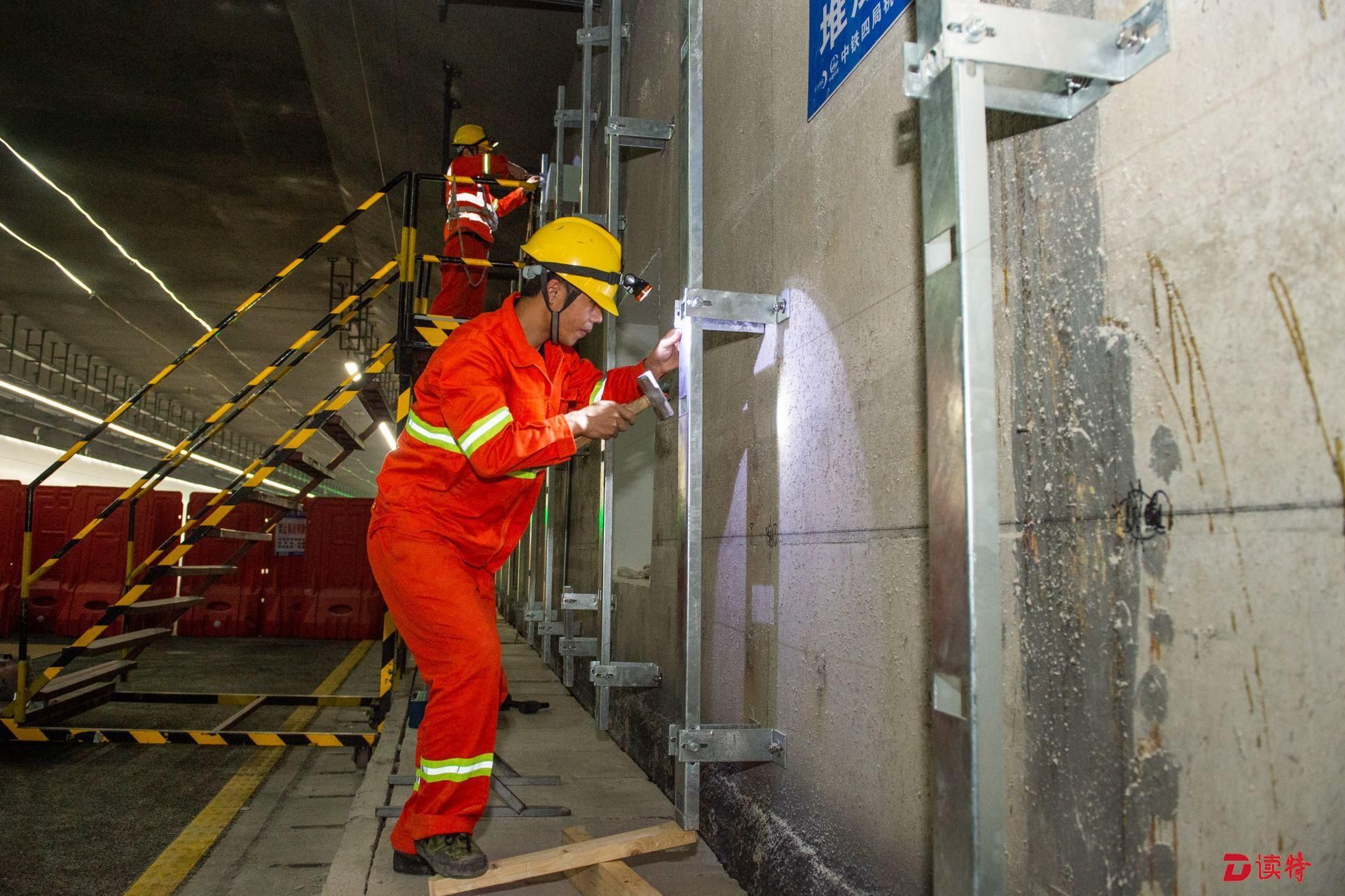 前海地下道路施工現(xiàn)場,工人安裝、校正搪瓷鋼板龍骨