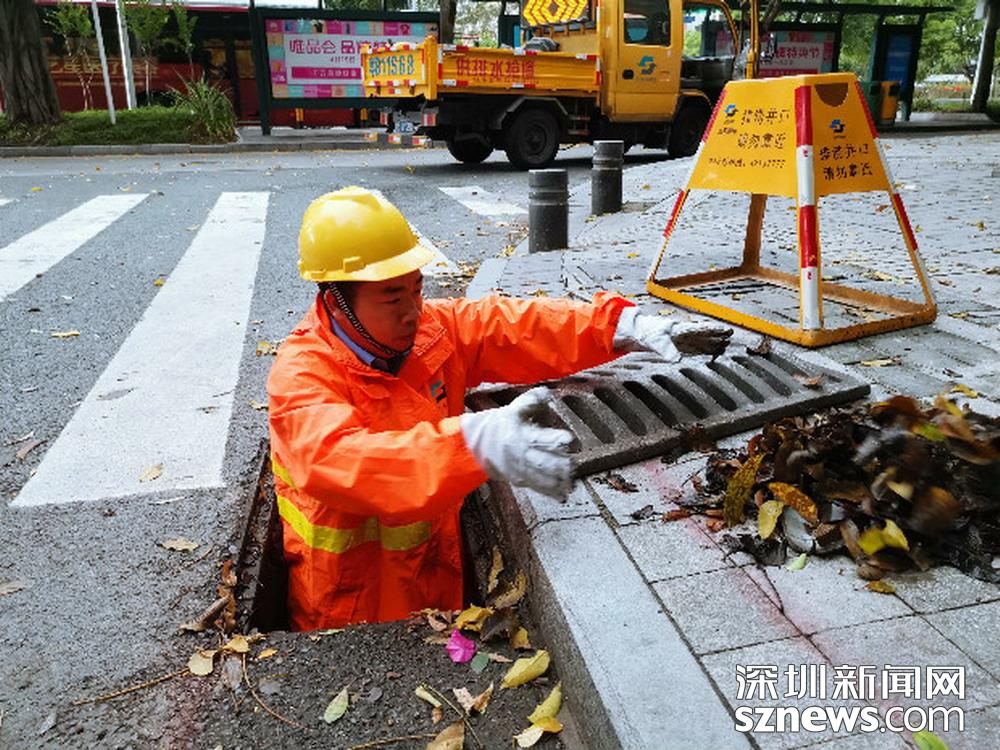 工作人員清理被樹葉堵住的排水口