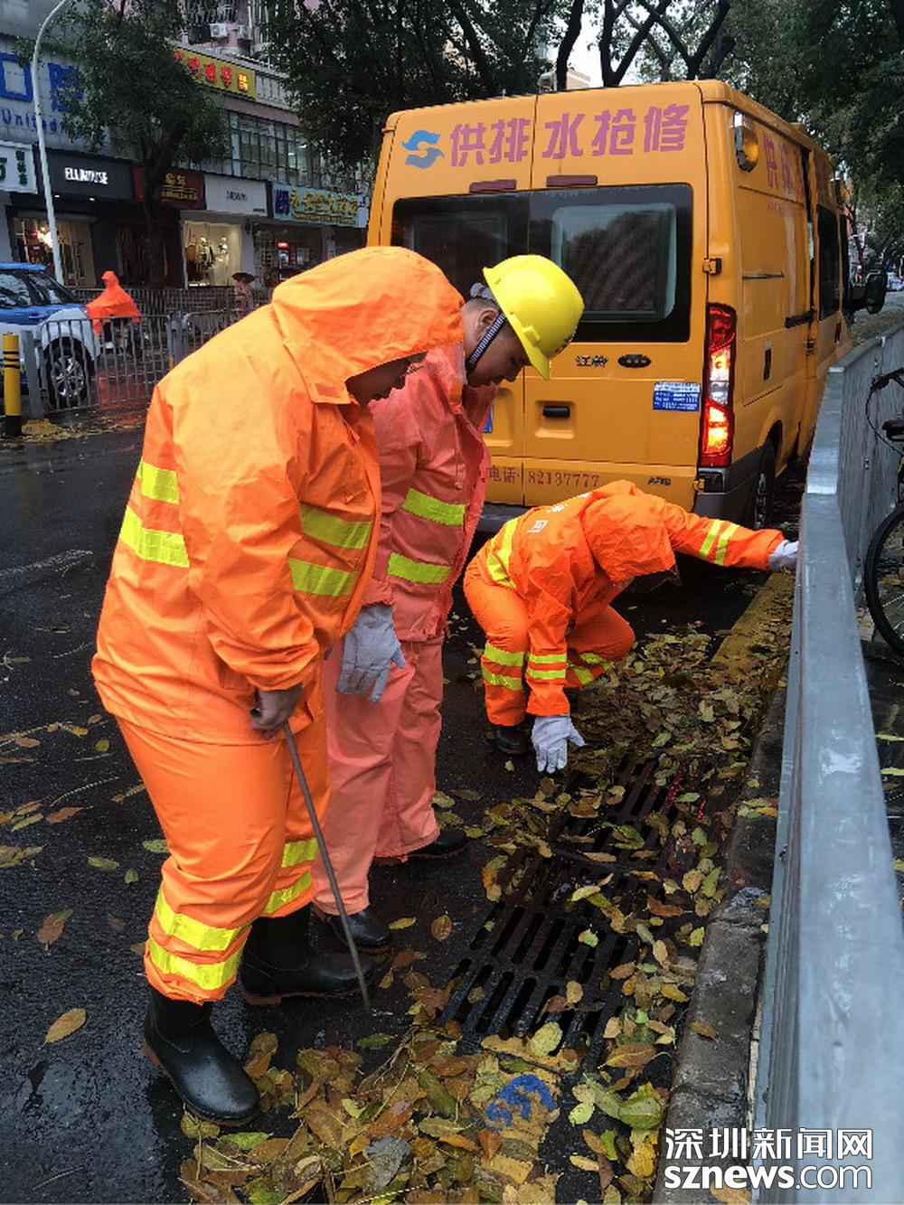 福田區(qū)深南路證券大廈前,工作人員正打開雨水篦子加速排水