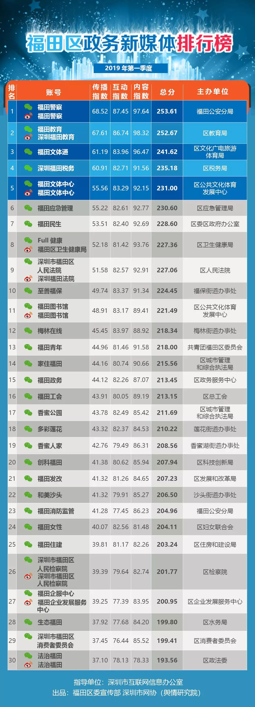 榜單根據(jù)新媒體屬性以及政務(wù)信息公開工作特點,將福田區(qū)各政務(wù)部門及公營單位開設(shè)的新媒體賬號,按照傳播指數(shù)(100分)、內(nèi)容指數(shù)(100分)、服務(wù)指數(shù)(100分)三項指標進行綜合評價,計分排名,形成榜單。