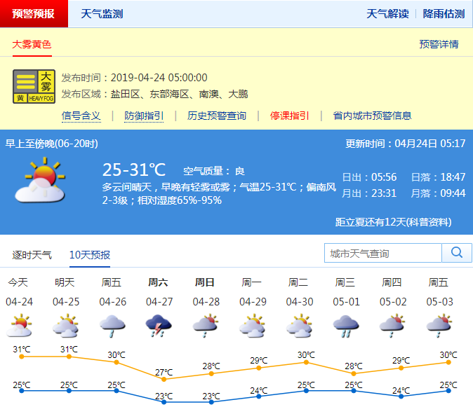 深圳市氣象局預(yù)計24日多云,中午前后悶熱,早晚有輕霧或霧,氣溫25-31℃;25-26日多云,局地有短時陣雨或雷陣雨;26日夜間至28日有一次雷雨過程,局地有大到暴雨。