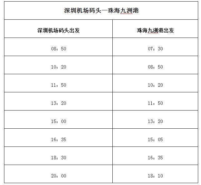 據(jù)深圳航運(yùn)集團(tuán)介紹,深圳機(jī)場碼頭至珠海九洲港航線開通后,每天共計(jì)8個(gè)航班16個(gè)航次往返兩地,服務(wù)時(shí)間從早上7時(shí)30分一直到晚上20時(shí),基本實(shí)現(xiàn)公交化運(yùn)營。其中,由深圳機(jī)場碼頭出發(fā)的時(shí)間分別為8時(shí)50分、10時(shí)20分、11時(shí)50分、13時(shí)20分、15時(shí)、16時(shí)35分、18時(shí)30分和20時(shí);由珠海九洲港出發(fā)的時(shí)間分別為7時(shí)30分、8時(shí)50分、10時(shí)20分、11時(shí)50分、13時(shí)20分、15時(shí)05分、16時(shí)35分及18時(shí)10分。