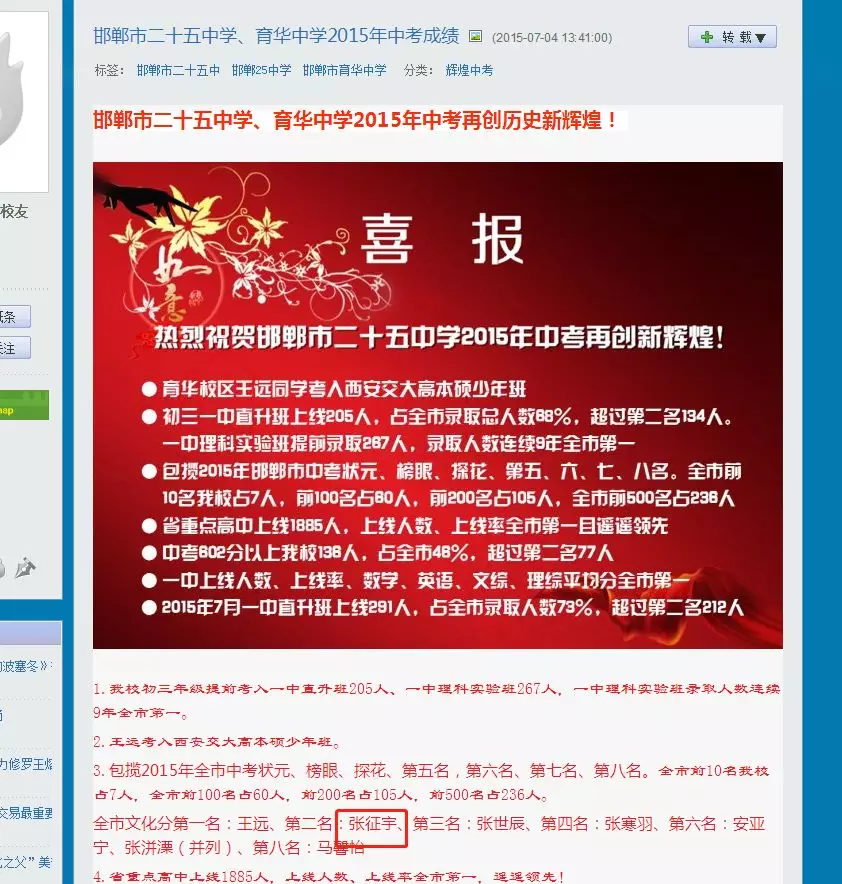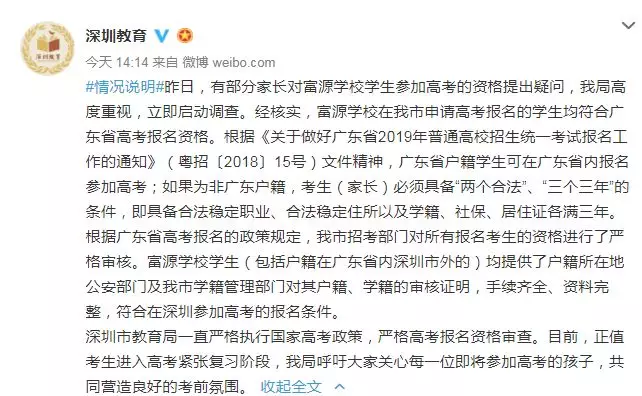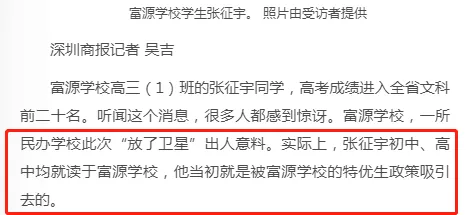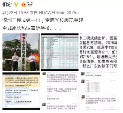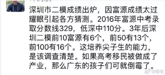 近日,深圳高三二模成績出爐,一所學(xué)校引起了深圳家長圈的高度關(guān)注。 有網(wǎng)友在微博上報料富源學(xué)校表現(xiàn)亮眼,一石激起千層浪,事件是怎么一回事呢?一起來看看 2019深二模各校尖子生成績 其中民辦學(xué)校寶安區(qū)富源學(xué)校異軍突起,尖子生占比遠超深圳最好的四大高中(深圳中學(xué),深圳實驗中學(xué),深圳外國語學(xué)校,深圳高級中學(xué)),引人注目。 網(wǎng)友議論紛紛 網(wǎng)友@相宅稱:深圳富源中學(xué),18年考中清北的學(xué)生名單和初中來源統(tǒng)計,經(jīng)過人肉搜索和大數(shù)據(jù)比對,確認相關(guān)證據(jù),有非常大的高考移民嫌疑。廣東高考本來就難,名校指標更少,還來擠占惹起公憤。同時附上19年深圳高考二模的富源成績。今年還有沒有高考移民,還會不會擠占廣東的名校指標? 針對網(wǎng)上的報料和家長的質(zhì)疑,深圳教育局@深圳教育回應(yīng)稱 情況說明 #情況說明#昨日,有部分家長對富源學(xué)校學(xué)生參加高考的資格提出疑問,我局高度重視,立即啟動調(diào)查。經(jīng)核實,富源學(xué)校在我市申請高考報名的學(xué)生均符合廣東省高考報名資格。根據(jù)《關(guān)于做好廣東省2019年普通高校招生統(tǒng)一考試報名工作的通知》(粵招〔2018〕15號)文件精神,廣東省戶籍學(xué)生可在廣東省內(nèi)報名參加高考;如果為非廣東戶籍,考生(家長)必須具備“兩個合法”、“三個三年”的條件,即具備合法穩(wěn)定職業(yè)、合法穩(wěn)定住所以及學(xué)籍、社保、居住證各滿三年。根據(jù)廣東省高考報名的政策規(guī)定,我市招考部門對所有報名考生的資格進行了嚴格審核。富源學(xué)校學(xué)生(包括戶籍在廣東省內(nèi)深圳市外的)均提供了戶籍所在地公安部門及我市學(xué)籍管理部門對其戶籍、學(xué)籍的審核證明,手續(xù)齊全、資料完整,符合在深圳參加高考的報名條件。 深圳市教育局一直嚴格執(zhí)行國家高考政策,嚴格高考報名資格審查。目前,正值考生進入高考緊張復(fù)習(xí)階段,我局呼吁大家關(guān)心每一位即將參加高考的孩子,共同營造良好的考前氛圍。 回應(yīng)之下,小編根據(jù)現(xiàn)有的資料,發(fā)現(xiàn)了這些信息出入,一起接著往下看! 對比:富源學(xué)校深圳一模成績 成績單顯示,在前十名單里,富源學(xué)校獨占6位,而深圳四大公辦重點高中總和也只有4位,這是什么情況?對照看一看一模成績: 三年來深圳中考錄取情況: 富源學(xué)??梢娚床徽純?yōu)勢 再來看一看三年來深圳中考錄取情況:富源學(xué)??梢娚床]有什么優(yōu)勢,總分460分的錄取分數(shù)比四大重點低了將近100分,但也不能因此說明該學(xué)校沒有尖子生源。 2018年富源學(xué)校高考清北名單:9位同學(xué)上清北 下圖是2018年幾所大學(xué)在廣東(理科)招生計劃: 但是,這幾名考進清北的同學(xué),名字竟然出現(xiàn)在兩所不同的高中??? 考進廣東前20名的張征宇同學(xué) 網(wǎng)友爆料稱,深圳富源中學(xué)2018年高考喜報,特別宣傳了張征宇同學(xué)(后成功考入清華大學(xué))。而他也出現(xiàn)在2015年的邯鄲市育華中學(xué)中考喜報上。乾坤大挪移,坐地日行八萬里! 家長質(zhì)疑:富源中學(xué)光榮榜的同學(xué) 怎么又出現(xiàn)在衡水中學(xué)喜報上? 針對上面9位同學(xué),搜索信息顯示,竟然有五位同學(xué)來自有名的高考大省河北。 在2018年的第31和32屆化學(xué)奧林匹克競賽的名單上,有一個共同的名字:崔一龍,但他們來自不同的學(xué)校。高二時他在衡水第一中學(xué),高三他出現(xiàn)在深圳富源中學(xué)。 同時,該網(wǎng)友還發(fā)了一封 #一位深圳中學(xué)生家長寫給教育部的控訴信# 尊敬的國家教育部領(lǐng)導(dǎo): 您好! 我是深圳市一名中學(xué)生的家長。這幾日網(wǎng)上流傳出一份深圳市高三年級第二次模擬考試前幾名學(xué)校分布成績單,其中民辦學(xué)校寶安區(qū)富源學(xué)校異軍突起,遠超深圳最好的四大高中(深圳中學(xué),深圳實驗中學(xué),深圳外國語學(xué)校,深圳高級中學(xué))引起廣大家長的關(guān)注。隨后網(wǎng)上流傳出是富源學(xué)校與河北衡水中學(xué)之間的高考移民消息,具體操作是通過將河北衡水中學(xué)的尖子生戶口轉(zhuǎn)移到深圳富源學(xué)校,平時在衡水中學(xué)上課,考試在深圳富源學(xué)校,并參加深圳市高考。此情況幾年前已有,數(shù)量沒有那么大。今年突然大量此類考生出現(xiàn),大家猜測,如果不加管控未來必將愈演愈烈。 作為一名普通深圳市民和學(xué)生家長,我守法遵紀,但是實在難以接受這樣的現(xiàn)實。希望教育部能夠徹查此事,查明真相,還廣大家長和考生一個公道。 記者調(diào)查 網(wǎng)上傳出深圳高三二模數(shù)據(jù)圖,記者向深圳某中學(xué)老師證實了該表格的真實性。從數(shù)據(jù)中可看到,深圳二模全市前十共有11名,其中富源6名,深圳中學(xué)3名,深圳實驗學(xué)校和市高級中學(xué)各占1名。有家長質(zhì)疑這是富源學(xué)校從衡水中學(xué)引入了高考移民,才導(dǎo)致二模成績一下子拔尖,并已申請要求有關(guān)部門徹查。 同時,小編梳理去年的報道發(fā)現(xiàn),張征宇同學(xué)此前的采訪顯示:張征宇初中、高中均就讀于富源學(xué)校,他當初就是被富源學(xué)校的特優(