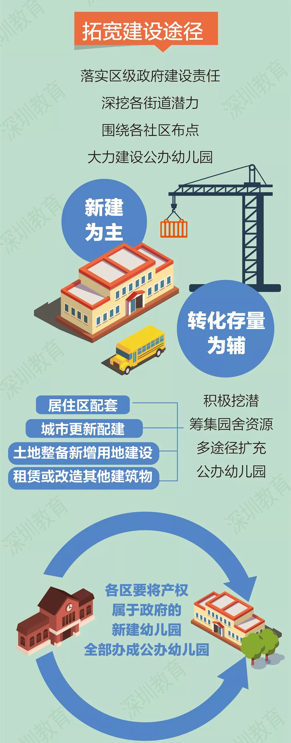深圳公辦園建設(shè)策略將以市政府主導(dǎo)統(tǒng)籌推進動,各區(qū)政府履行主體責(zé)任,挖掘各街道潛力,圍繞各社區(qū)布點,力爭每個社區(qū)有1-2所公辦園,每年新建2萬個以上學(xué)前教育學(xué)位。加大幼兒園規(guī)劃與建設(shè)力度,鼓勵社會力量興辦幼兒園和其他類型學(xué)前教育機構(gòu)。
