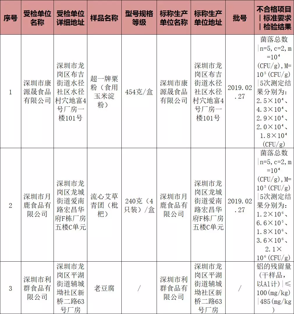 另有1批次食用玉米淀粉和1批次流心艾草青團皆被檢出菌落總數超標,它們的受檢單位依次是深圳市康源晟食品有限公司和深圳市月鹿食品有限公司。