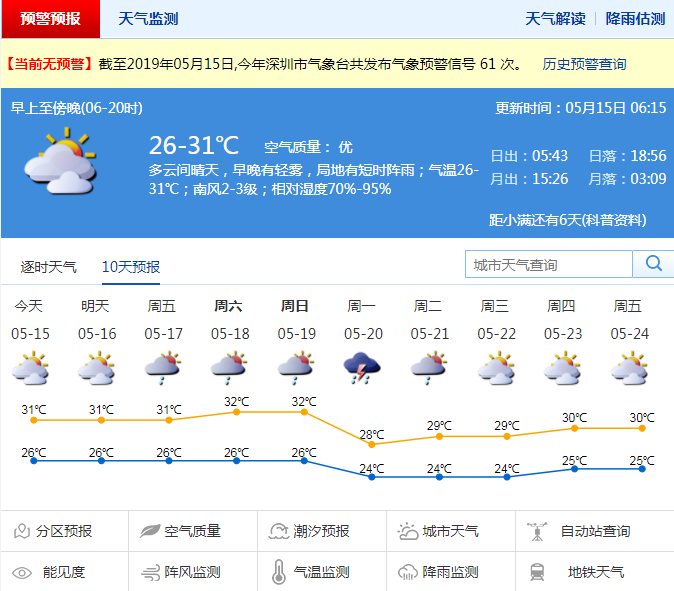 預(yù)計(jì)未來幾天持續(xù)炎熱,其中,15日深圳以多云天氣為主,局地有短時(shí)陣雨,早晚有輕霧,氣溫26℃至31℃;16日至19日持續(xù)炎熱,最高氣溫達(dá)32℃,以多云為主,局地有陣雨或雷陣雨;20日前后將有一次明顯降雨過程。
