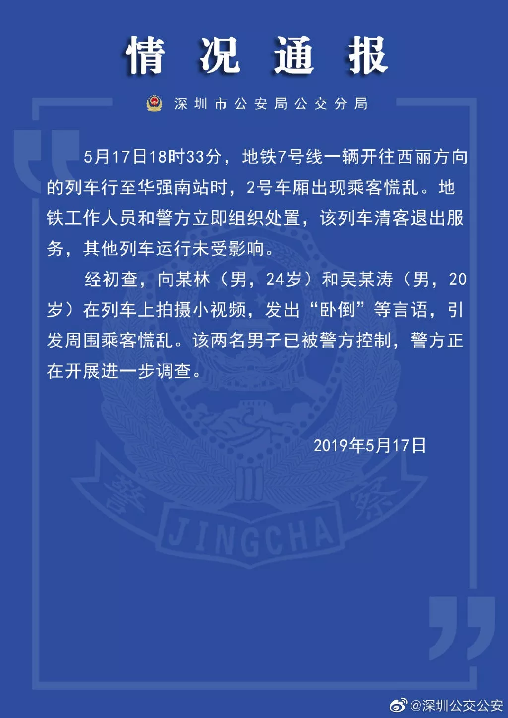 據(jù)深圳公交公安介紹,5月17日18時33分,地鐵7號線一輛開往西麗方向的列車行至華強南站時,2號車廂出現(xiàn)乘客慌亂。地鐵工作人員和警方立即組織處置,該列車清客退出服務,其他列車運行未受影響。