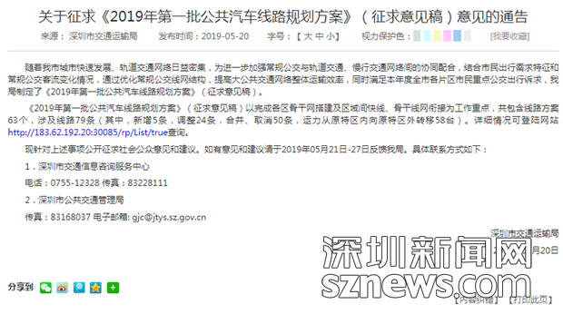 目前,市民可登陸網(wǎng)站http://jtys.sz.gov.cn/查詢?cè)敿?xì)情況。同時(shí),深圳市交通運(yùn)輸局就上述事項(xiàng)公開(kāi)征求社會(huì)公眾意見(jiàn)和建議,如有意見(jiàn)和建議請(qǐng)于2019年05月21日-27日反饋至深圳市交通運(yùn)輸局。具體聯(lián)系方式如下: