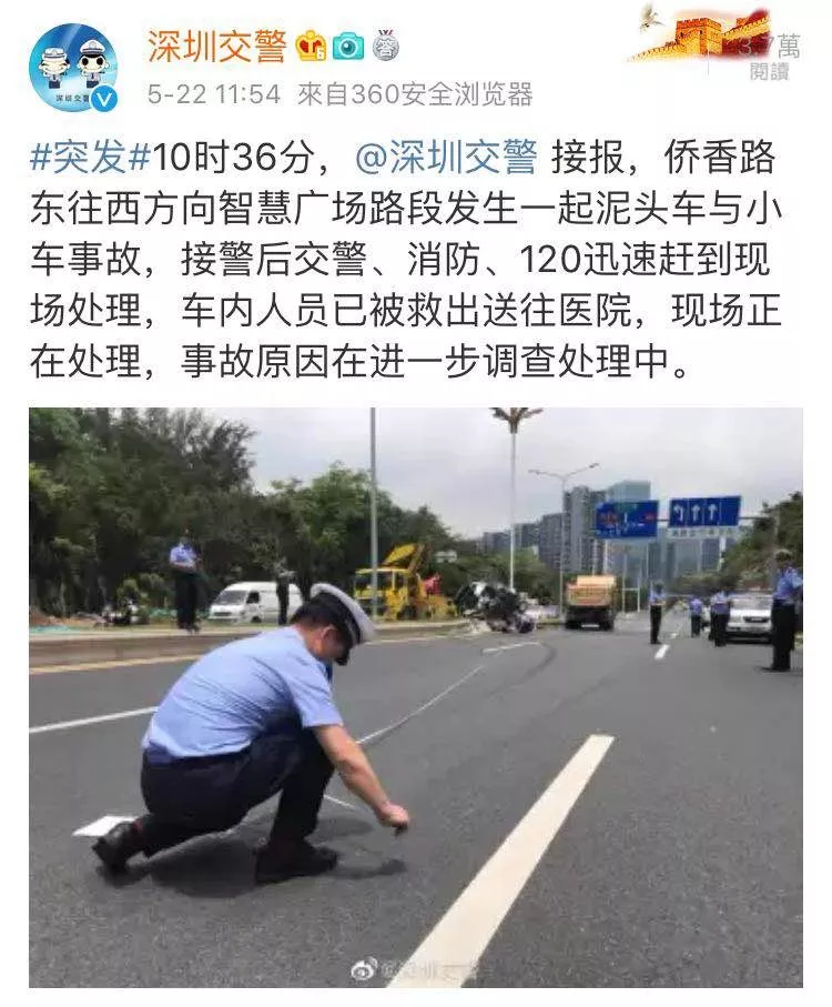 據(jù)@深圳交警官方微博消息,10時(shí)36分,僑香路東往西方向智慧廣場(chǎng)路段發(fā)生一起泥頭車與小車事故,接警后交警、消防、120迅速趕到現(xiàn)場(chǎng)處理,車內(nèi)人員已被救出送往醫(yī)院,現(xiàn)場(chǎng)正在處理,事故原因在進(jìn)一步調(diào)查處理中。