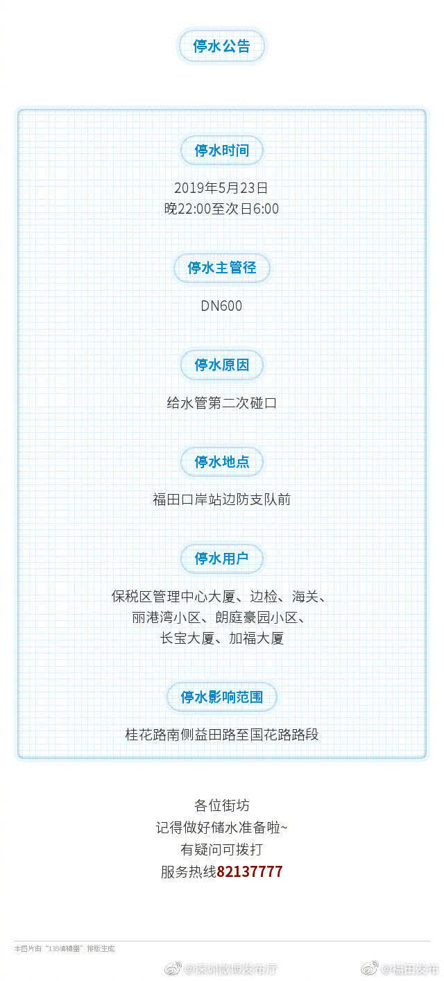 溫馨提醒!今天晚上22:00至明日6:00,福田區(qū)保稅區(qū)管理中心大廈、邊檢、海關(guān)、麗港灣小區(qū)、朗庭豪園小區(qū)、長寶大廈、加福大廈等區(qū)域?qū)⒂?jì)劃停水,各位街坊記得做好儲水準(zhǔn)備?。〈料聢D了解更多停水停電資訊!