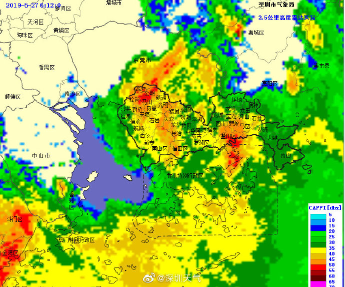 深圳市氣象臺于2019年05月27日09時15分將暴雨紅色和暴雨橙色分區(qū)預(yù)警降級為暴雨黃色預(yù)警,預(yù)計今天白天我市仍有雷雨,部分時間雨勢較大,全市暴雨黃色和雷電預(yù)警生效中,請繼續(xù)做好防御。