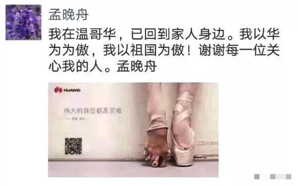 當(dāng)?shù)貢r(shí)間2018年12月1日,加拿大當(dāng)局應(yīng)美方要求,扣留了在加拿大機(jī)場轉(zhuǎn)機(jī)的孟晚舟,美國隨后承認(rèn),正在尋求對孟晚舟的引渡。10天之后,2018年12月11日,加拿大法院作出裁決,批準(zhǔn)孟晚舟的保釋申請。當(dāng)晚,走出法庭的孟晚舟發(fā)朋友圈表示,我以華為為傲,我以祖國為傲。配圖就是那張“芭蕾腳”的華為廣告圖,上面寫著:偉大的背后都是苦難。外界擔(dān)心,由于不斷升級的中美貿(mào)易摩擦,可能會影響到孟晚舟在加拿大的引渡訴訟。