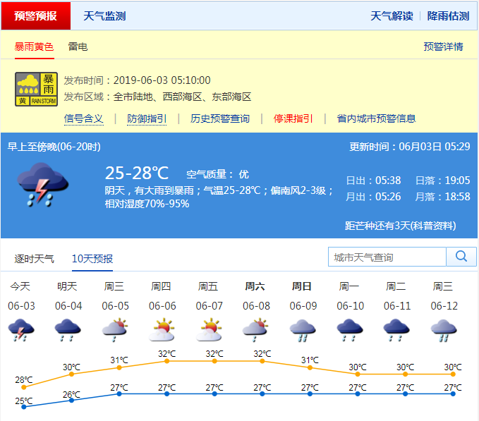 【上班天氣】預計早晨6-9時,全市陰天,有大雨到暴雨;氣溫25-27℃;偏南風2-3級,雨時最大陣風6-7級;相對濕度85%-100%;全市能見度3-10公里,雨時能見度較差,注意交通安全;降雨時間長,請合理做好出行安排。深圳市氣象臺2019年06月03日05:39發(fā)布。