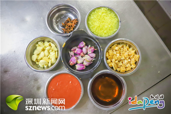 準備好五花肉和燜好的芋頭,五花八門的材料也準備輪番上場。歐石林將八角、料酒、醬油、鹽、姜蓉、蔥頭、蒜頭、南乳、片糖粒和花生油等細心地按比例分配在每個調(diào)料碟里,在他看來,一道好菜正是這些調(diào)料的“秀場”,但拿捏精準卻不是件易事。
