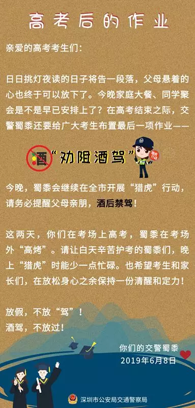 深圳新聞網(wǎng)2019年6月10日訊(記者 高暢韻)高考圓滿(mǎn)結(jié)束,很多有考生的家庭做的第一件事,就是帶上家人朋友聚聚餐,犒勞一下孩子跟自己。但放假不放“駕”,孩子們有努力完成考試,父母?jìng)?span style="text-indent: 32px;">有乖乖地酒后不開(kāi)車(chē)嗎?這不,高考結(jié)束當(dāng)晚,就有14只"醉貓"被抓獲······