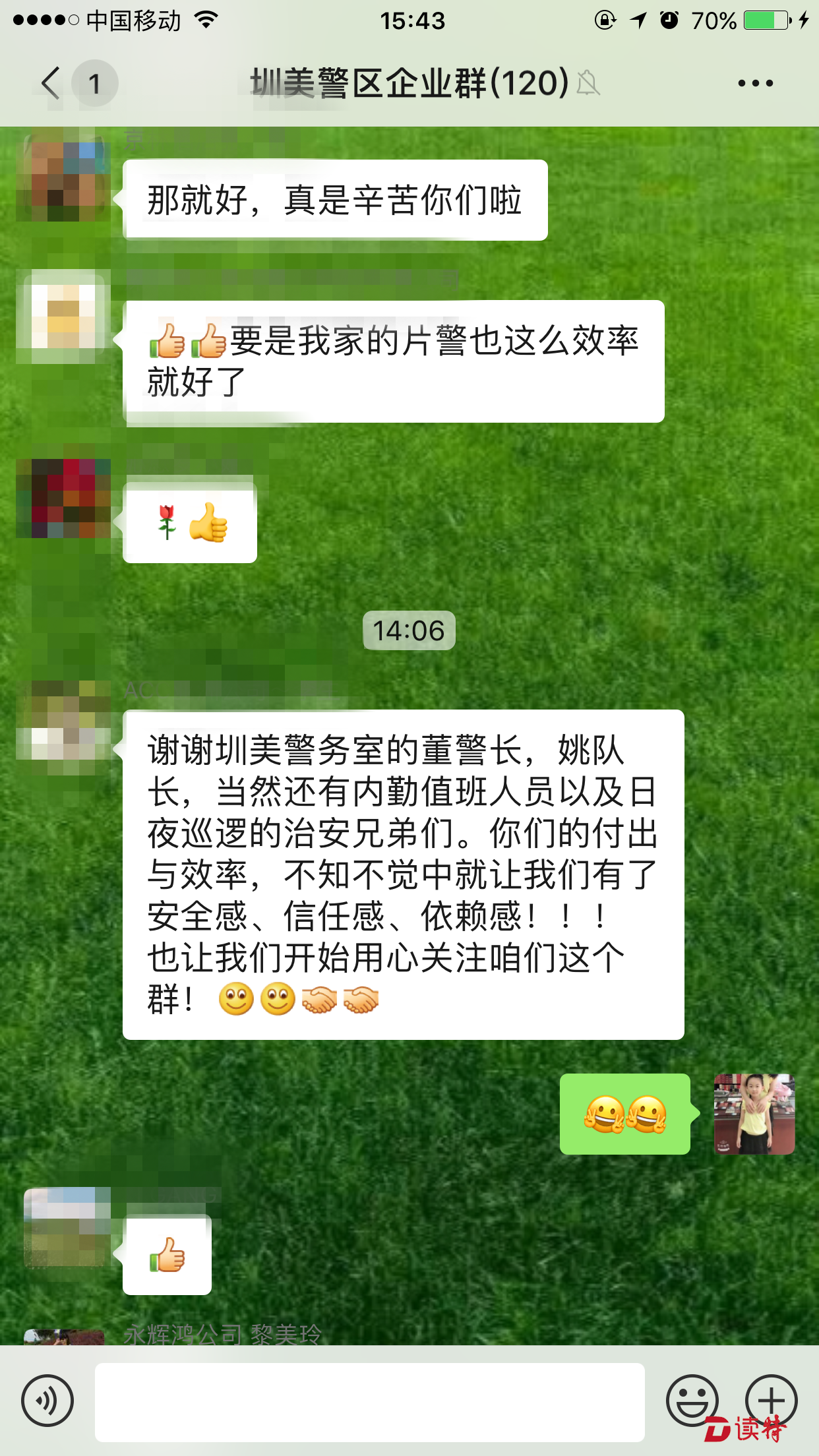 就在圳美警區(qū)隊(duì)員現(xiàn)場處置的過程中,微信群中的成員紛紛詢問事件情況。在了解到圳美警務(wù)室的隊(duì)員不到1分鐘就趕到現(xiàn)場后,大家對警區(qū)工作人員接連點(diǎn)贊。(讀特記者 王茂程 通訊員 胡澤瑜 溫小龍)