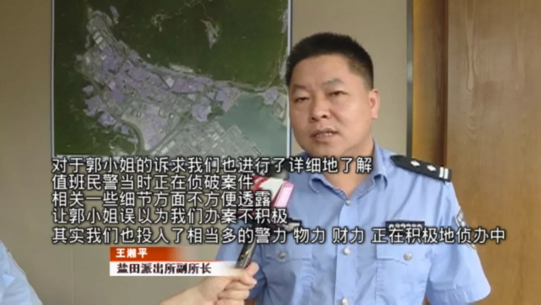 派出所表示,案件正在偵查當(dāng)中記者也和郭女士來(lái)到鹽田派出所,由于負(fù)責(zé)此案的蔡警官正值休假,派出所的一位值班領(lǐng)導(dǎo),對(duì)郭女士當(dāng)時(shí)所遭遇的處境,進(jìn)行了情況說(shuō)明。