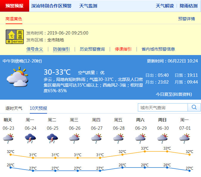 深圳新聞網(wǎng)2019年6月22日訊 受副熱帶高壓的影響,近幾日深圳氣溫持續(xù)上升,昨日(夏至)白天最高氣溫32℃~34℃,中北部及人口密集區(qū)最高氣溫達(dá)到35℃以上,全市高溫黃色預(yù)警生效中。周末恰逢中考到來(6月22日至24日),預(yù)計(jì)22日天氣炎熱到酷熱,中北部及人口密集區(qū)最高氣溫可達(dá)35℃或以上,提醒考生家長(zhǎng)出門做好防暑降溫措施。