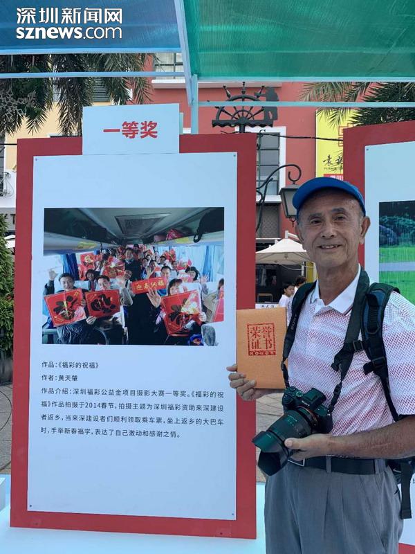 “我從報(bào)紙上看見(jiàn)深圳福彩舉辦的返鄉(xiāng)活動(dòng),覺(jué)得這個(gè)做公益獻(xiàn)愛(ài)心的活動(dòng)讓我很感動(dòng)。我想通過(guò)我的照片來(lái)彰顯深圳是一個(gè)大愛(ài)的城市,來(lái)讓大家看到深圳福彩的愛(ài)心宗旨?!?2歲的黃天肇憑借《福彩的祝?!纷髌窐s獲本次大賽一等獎(jiǎng)。作為資深的攝影愛(ài)好者,他從深圳福彩舉辦“愛(ài)心福彩資助來(lái)深建設(shè)者春節(jié)返鄉(xiāng)”活動(dòng)開(kāi)始,用相機(jī)記錄了十余年,“那個(gè)時(shí)候我都是用的傻瓜相機(jī)拍,獲獎(jiǎng)的作品就是我用傻瓜相機(jī)拍的,直到這兩年才開(kāi)始用數(shù)碼相機(jī)?!睂?duì)于此次展覽,黃天肇認(rèn)為深圳福彩組織選出的98張照片,承載著深圳對(duì)孤寡老人、弱勢(shì)群體、特困戶(hù)的關(guān)心,彰顯了深圳人的大愛(ài),也激發(fā)市民通過(guò)購(gòu)彩的方式奉獻(xiàn)愛(ài)心,他表示會(huì)一直用照片銘記這些珍貴的記憶。