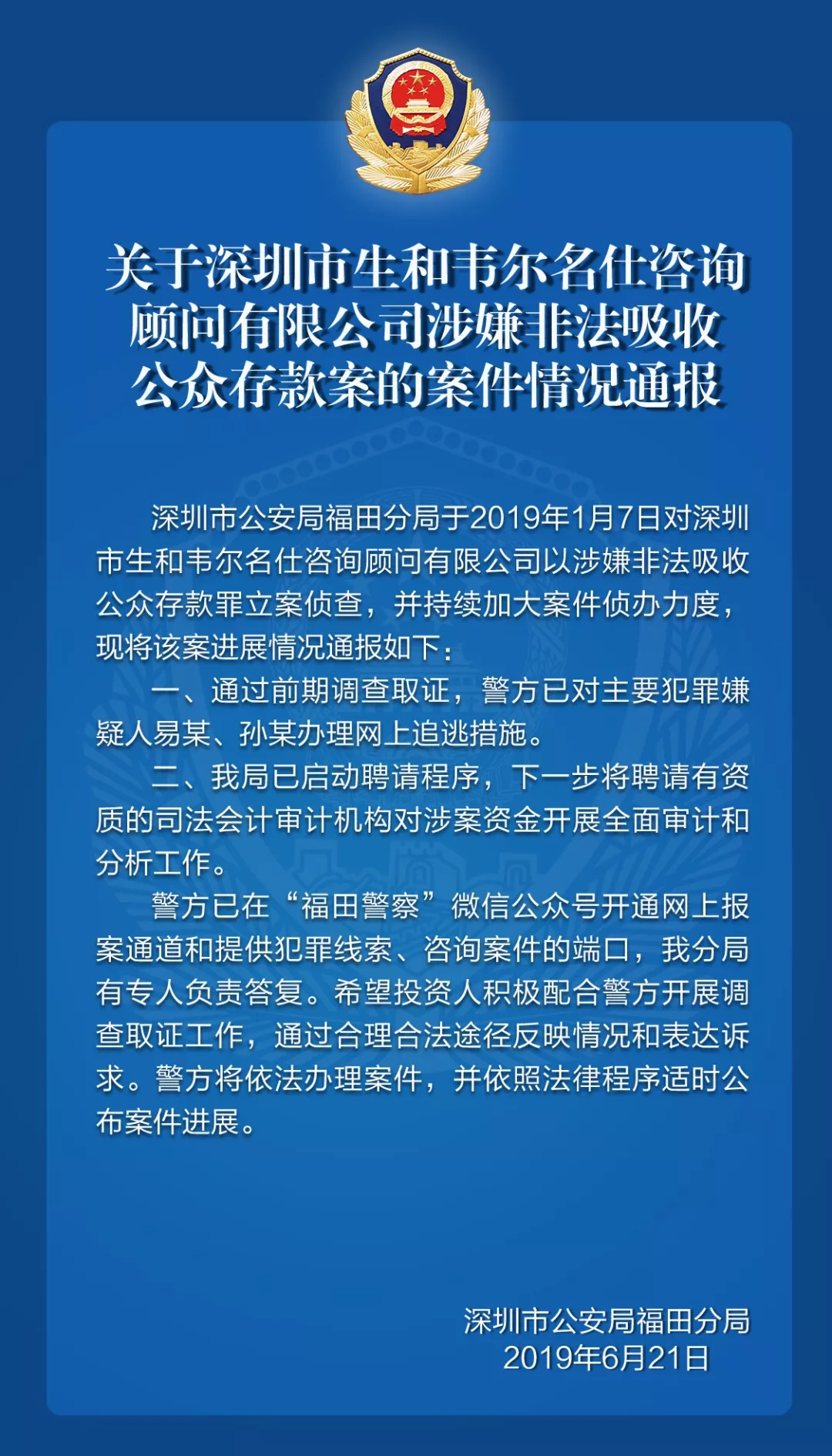 關(guān)于深圳市生和韋爾名仕咨詢顧問(wèn)有限公司涉嫌非法吸收公眾存款案的案件情況通報(bào)