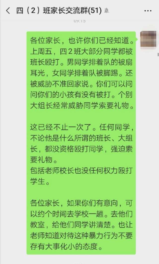 據(jù)女兒反映,當(dāng)天上午課間時(shí)分,班長(zhǎng)(女)將班上的學(xué)生集合在一起,以違反紀(jì)律為由要體罰他們?!叭嗝麑W(xué)生排著隊(duì)被班長(zhǎng)毆打,男生被扇耳光,女生被腳踢。”