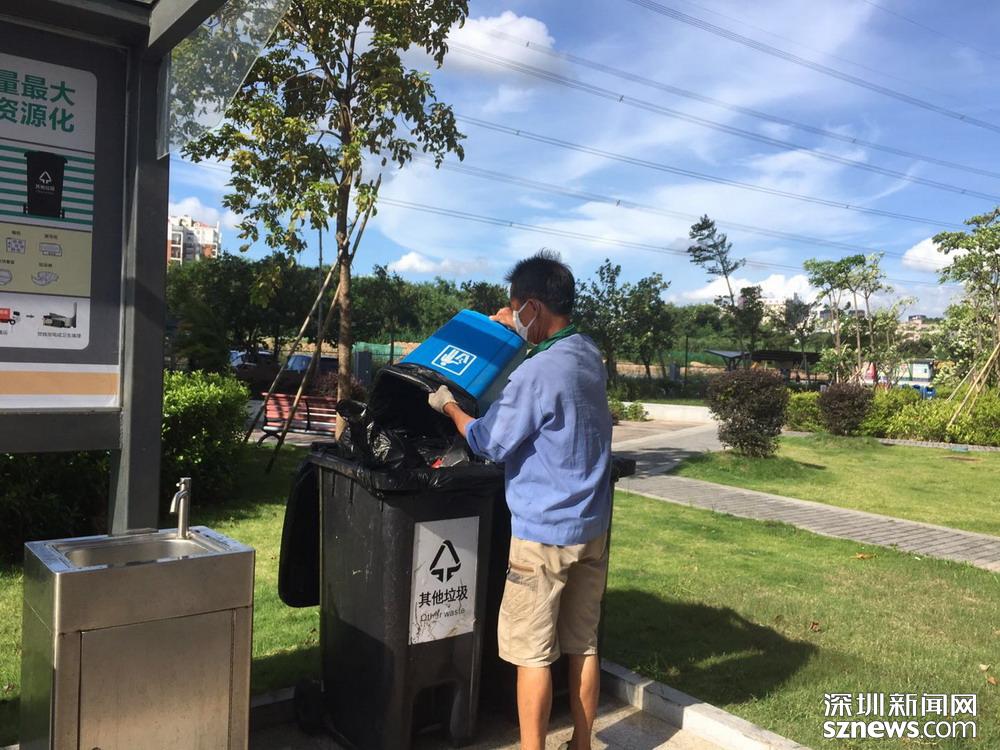 鄧伯今年60歲,是來深圳帶孫子的,因?yàn)槔习槟軒兔Γ运麘?yīng)聘成為了一名小區(qū)清潔員。小區(qū)實(shí)行垃圾分類一年多以來,鄧伯工作輕松了很多。每天他只需巡視幾遍垃圾桶,將滿了的垃圾裝在框里帶回暫存點(diǎn),進(jìn)行二次分揀和清洗后,再將垃圾桶歸放原處;等物業(yè)在微信平臺(tái)上聯(lián)系好運(yùn)送車輛,協(xié)助運(yùn)送人員運(yùn)走垃圾就行。