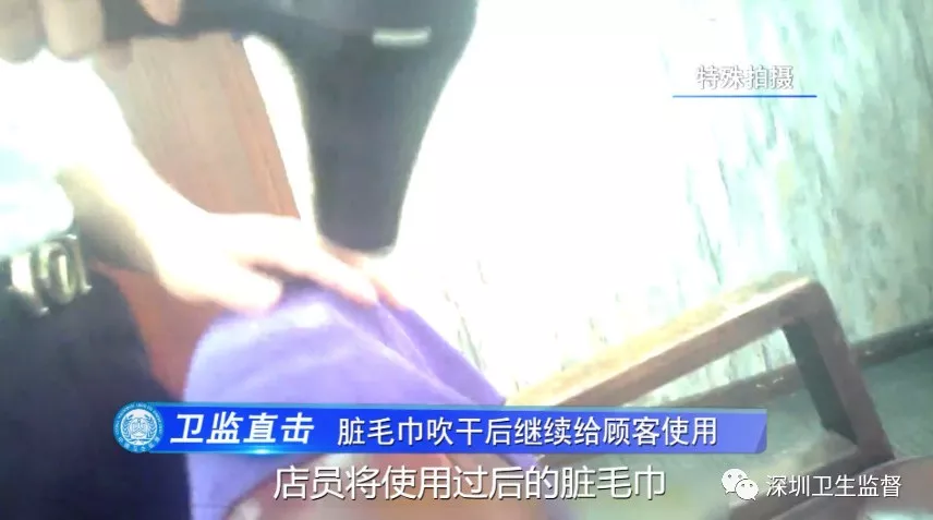 更讓人無(wú)法接受的是,當(dāng)干凈毛巾不夠用的時(shí)候,店員將使用過(guò)后的臟毛巾,未經(jīng)過(guò)清洗消毒,就用吹風(fēng)機(jī)吹干后,重新放回干凈毛巾取用架內(nèi),繼續(xù)直接給顧客洗頭、擦臉用。