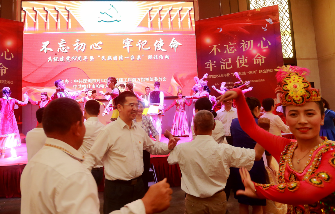深圳新聞網(wǎng)2019年7月1日訊 盛夏七月,紅色黨旗迎風飄,為積極響應(yīng)黨中央關(guān)于在全黨開展“不忘初心牢記使命”主題教育的重大部署。6月30日,深圳援疆前方指揮部、中共喀什市帕哈太克里鄉(xiāng)委員會聯(lián)合組織開展慶祝建黨98周年暨“民族團結(jié)一家親聯(lián)誼”活動??κ驳貐^(qū)行署領(lǐng)導(dǎo)、全體援疆干部人才、帕哈太克里鄉(xiāng)結(jié)親群眾等300余人參與活動。