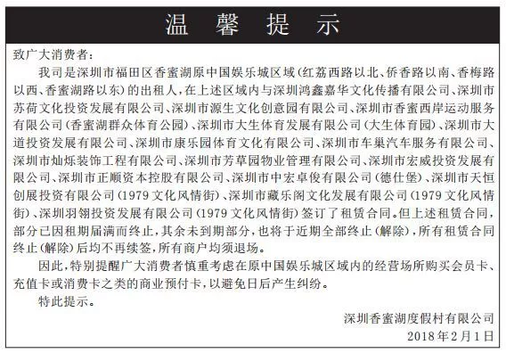 2018年2月1日,深圳香蜜湖度假村有限公司(原香蜜湖中國(guó)娛樂(lè)城區(qū)域的出租人)發(fā)布了所有商戶均須退場(chǎng)的公告。