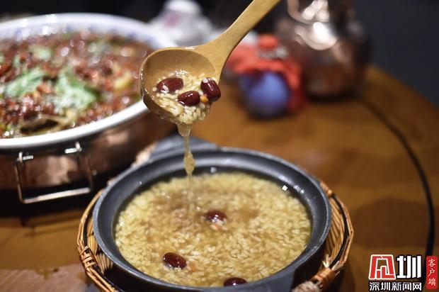 紅糖陰米粥作為主食,溫潤(rùn)甘甜,口感濃稠,小米粥里熬煮了紅棗枸杞,補(bǔ)血補(bǔ)氣,在一眾重油的江湖菜中可以解辣解膩,還能感受酒糟帶來的養(yǎng)生驚喜。