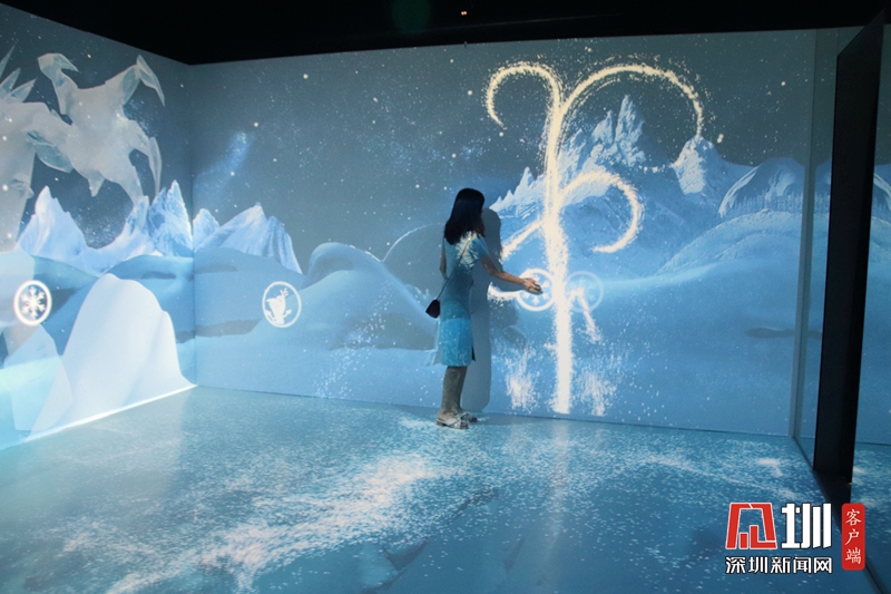 展覽還加入了體感偵測(cè)技術(shù),冰山雪景隨著光影變換而變幻,就如同艾莎女王特別為粉絲們施展的冰晶魔法:足跡所到之處,雪花和冰晶變幻各種魔法特效,用手觸摸圓圈,還能在屏幕上升騰起一朵云,或者一串飛舞的雪花。艾莎女王、安娜公主和克里斯托夫也有可能現(xiàn)身在屏幕上