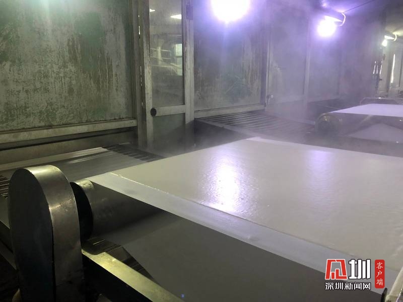 經(jīng)過(guò)110攝氏度以上的高溫蒸煮后,米漿變成熟化的米片,等待切條。