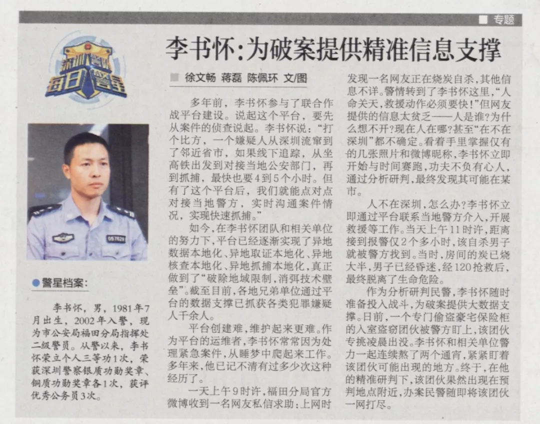 一天上午9時許,福田分局官方微博收到一名網(wǎng)友私信求助:上網(wǎng)時發(fā)現(xiàn)一名網(wǎng)友正在燒炭自殺,其他信息不詳。警情轉(zhuǎn)到了李書懷這里,“人命關(guān)天,救援動作必須要快!”但網(wǎng)友提供的信息太貧乏——人是誰?為什么想不開?現(xiàn)在人在哪?甚至“在不在深圳”都不確定??粗掷镎莆諆H有的幾張照片和微博昵稱,李書懷立即開始與時間賽跑,功夫不負(fù)有心人,通過分析研判,最終發(fā)現(xiàn)其可能在某市。