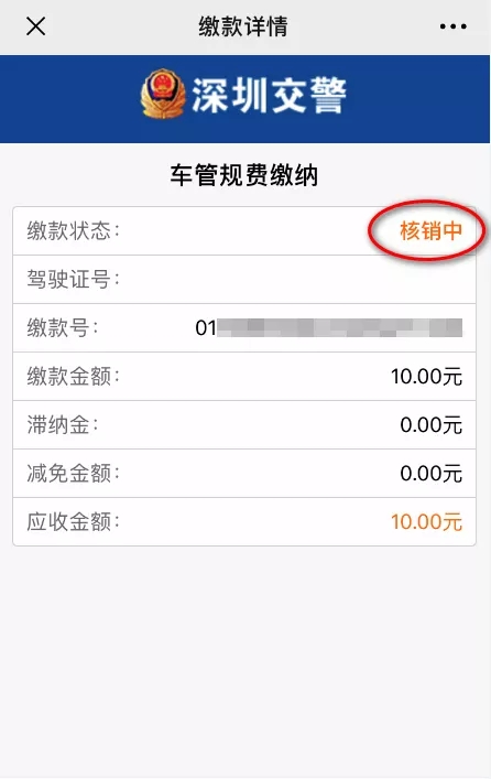 03 提交繳費(fèi)后,核對(duì)繳款號(hào)(前面會(huì)多01),應(yīng)收金額為10元。繳費(fèi)后再次查詢?cè)摿魉?,狀態(tài)為“核銷中”(即繳費(fèi)成功)。
