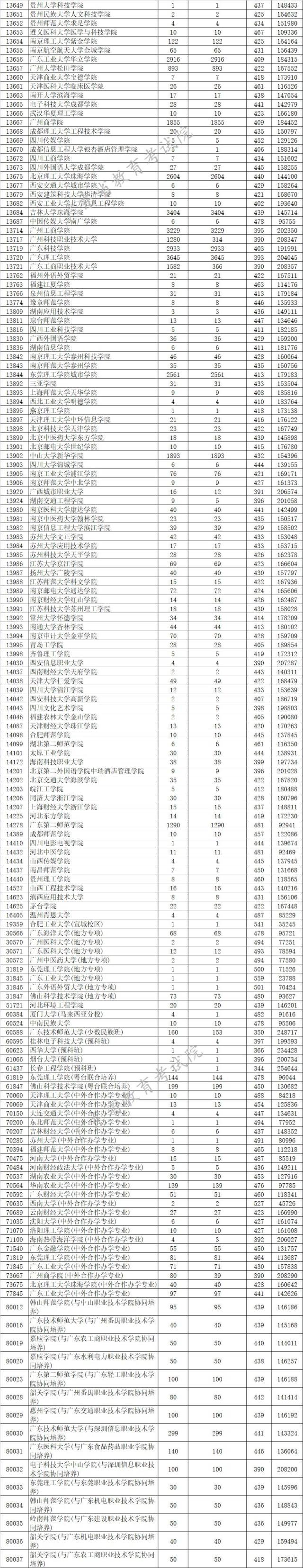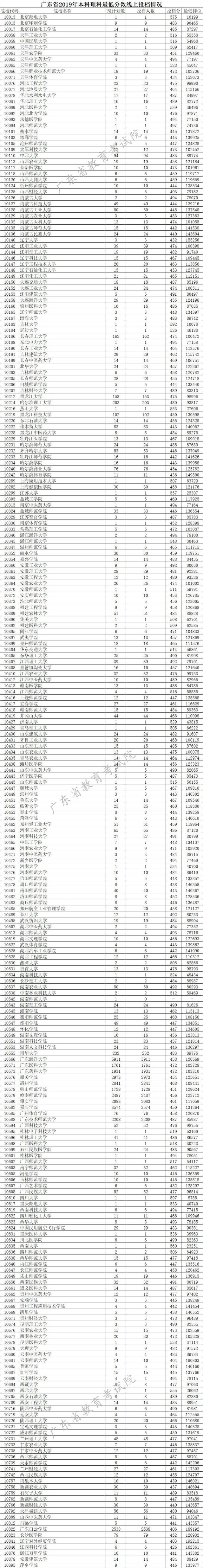 廣東省2019年本科理科最低分數線上投檔情況