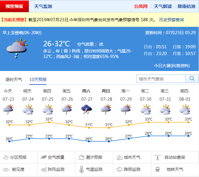 深圳新聞網(wǎng)2019年7月23日訊 市氣象局預計深圳23日多云為主,有(雷)陣雨,部分時間雨勢較大,局部地區(qū)雨量可達中到大雨量級;氣溫27-32℃,中午前后體感略顯悶熱;西南風2-3級;相對濕度65%-95%。24-26日轉(zhuǎn)炎熱天氣,午后易激發(fā)熱對流性降雨,最高氣溫33-35℃;27-28日降雨增多,部分時間雨勢較大。
