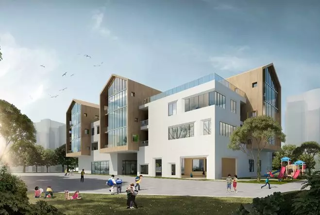 建筑造型簡潔現(xiàn)代,在白色體量上嵌入三個木色坡屋頂體塊,如積木城堡一般,富有童趣,建筑設有集中活動平臺作為補充。
