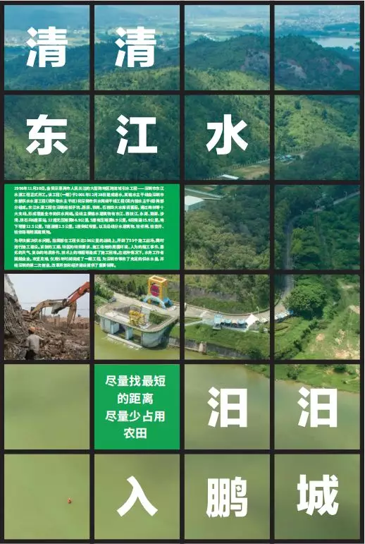 第三部分“清清東江水汩汩入鵬城”,著重展示東江水源工程建設(shè)的全過程。以工程線路為展覽線索,再現(xiàn)水務(wù)工作者在長達(dá)106公里的戰(zhàn)線上奮戰(zhàn)的場(chǎng)面。通過輸水設(shè)施的新舊照片對(duì)比,描繪出一條在深惠兩城平地崛起的深圳“生命線”。
