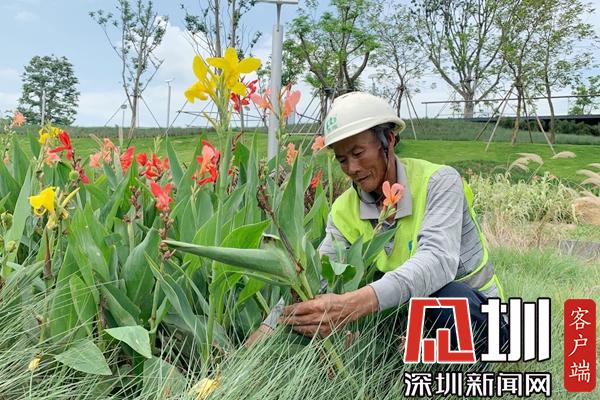謝成生來(lái)深圳已經(jīng)快五年了,常年在戶外勞作的他,皮膚被太陽(yáng)曬得黝黑。前海運(yùn)動(dòng)公園是今年4月份剛剛開園的,作為前海城市新中心首個(gè)運(yùn)動(dòng)主題公園,這里的每一株植物,都浸透著謝成生的汗水。