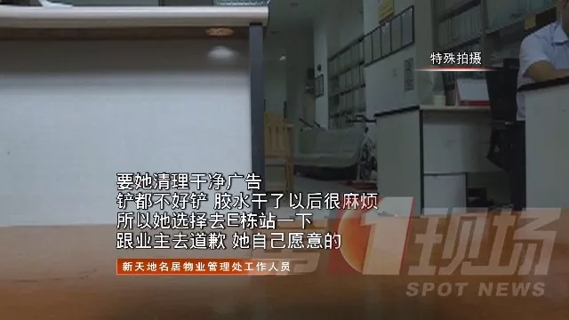 當時這名女子在小區(qū)E棟樓層里張貼小廣告,物業(yè)發(fā)現后把她帶到管理處,要求她自行清理掉自己張貼的所有廣告,或者道歉,二者選其一。