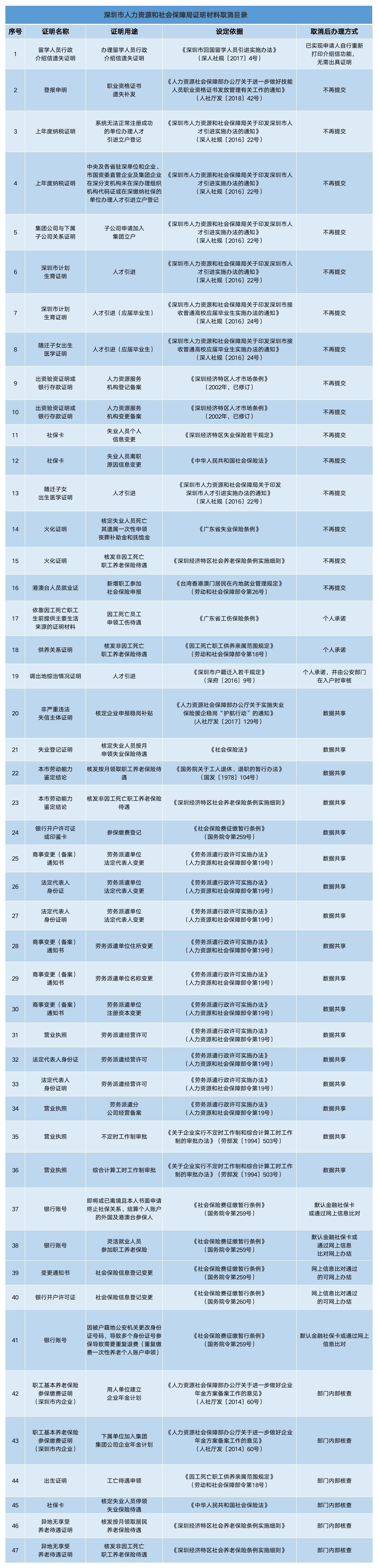 深圳新聞網(wǎng)2019年7月25日訊(見圳客戶端、深圳新聞網(wǎng)記者 施冰冰)據(jù)“深圳人社”微信公眾號消息,為了減證便民、優(yōu)化服務(wù),深圳市人力資源和社會保障局取消了47項(xiàng)證明材料。其中包括新增職工參加社會保險(xiǎn)申報(bào),港澳臺人員就業(yè)證不用再提交;人才引進(jìn)(應(yīng)屆畢業(yè)生),深圳市計(jì)劃生育證明、隨遷子女出生醫(yī)學(xué)證明無需再提交;勞務(wù)派遣單位法定代表人變更,法定代表人身份證、商事變更(備案)通知書等實(shí)現(xiàn)數(shù)據(jù)共享等等等等……