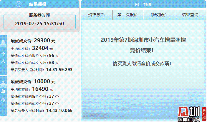 見圳客戶端?深圳新聞網2019年7月25日訊(見圳客戶端 深圳新聞網記者 涂勝)7月25日下午,深圳市2019年第7期小汽車增量指標競價結果出爐,個人最低成交價為29300元,平均成交價為32404元,與上期相比,個人最低成交價上漲5100元,平均成交價上漲445元。但與深圳出臺機動車車牌指標放寬政策之前相比,競拍價幾乎“腰斬”(2019年第五期個人最低成交價為60100元,平均成交價為69873元)。