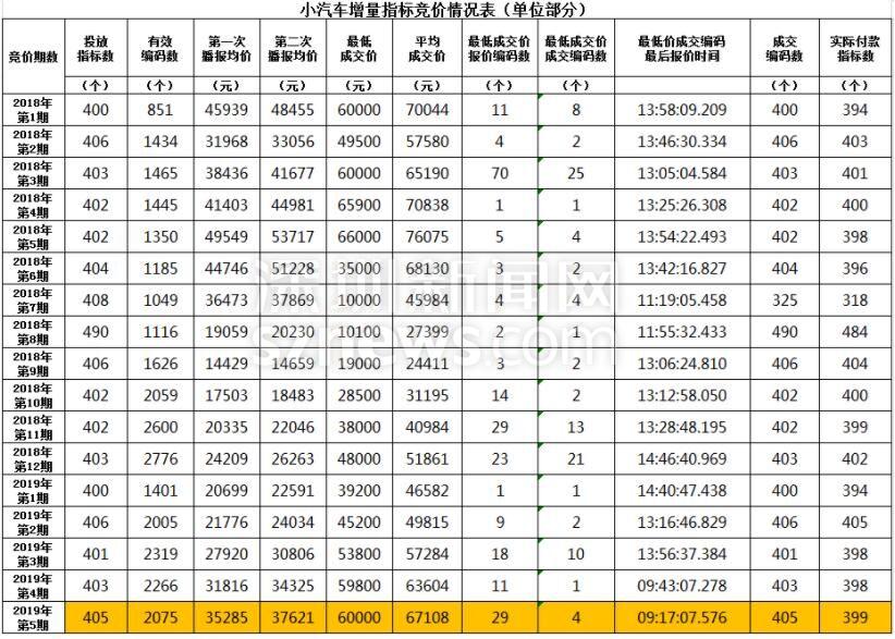 小汽車增量指標競價情況表單位部分(2018年第一期——2019年第五期)