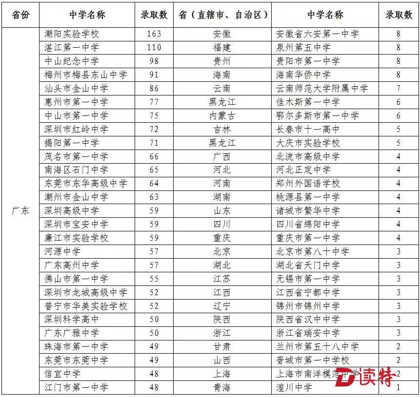 絕大部分考生來自全國知名重點中學。其中廣東的潮陽實驗學校錄取人數(shù)最多,達到163人;湛江第一中學錄取110人;中山紀念中學錄取98人。深圳錄取人數(shù)最多的是紅嶺中學,錄取72人。