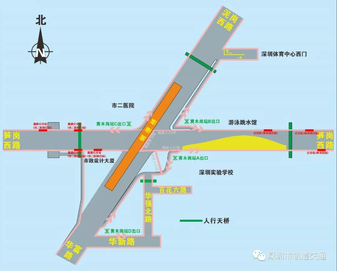 在本次調(diào)整中,華富路-泥崗西路南北向交通只能通過(guò)鋼便橋雙向六車(chē)道行車(chē)。泥崗西路、華富路、筍崗西路左轉(zhuǎn),行人線(xiàn)路及“市二醫(yī)院”,“體育館”公交站臺(tái)均有所調(diào)整。