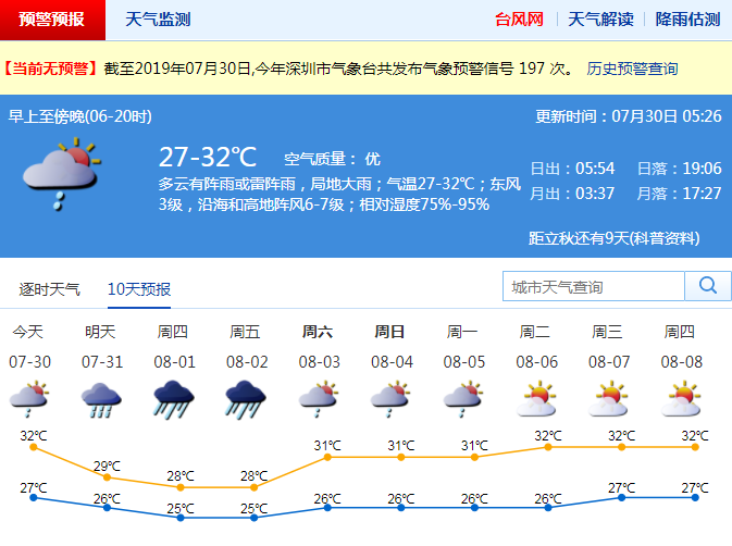 見(jiàn)圳客戶(hù)端·深圳新聞網(wǎng)2019年7月30日訊 今天多云,有陣雨或雷陣雨,局地暴雨;氣溫27-32℃;東南風(fēng)3級(jí);相對(duì)濕度70%-95%。31日有雷陣雨,局部暴雨,最大陣風(fēng)8級(jí)左右;8月1-2日降雨加大,有暴雨;3日起降雨減弱。