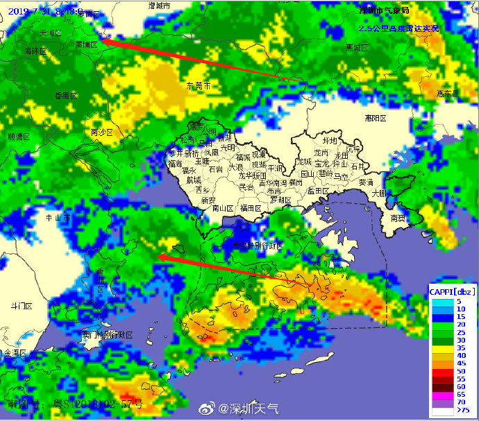 當(dāng)一條雨帶的長軸和雨帶的移動方向(箭頭)夾角很小時,某個地方就會被這條雨帶幾乎從頭到尾地經(jīng)過,于是這個地方的累計雨量就會特別大。而現(xiàn)在深圳靠南的大部分區(qū)域就在經(jīng)歷一場列車效應(yīng),所以這場雨持續(xù)時間比較長,短時間內(nèi)停不下來。