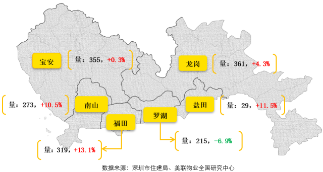 福田、南山、鹽田三個(gè)區(qū)成交套數(shù)環(huán)比均出現(xiàn)超過1成的增長;而但從成交套數(shù)來看,羅湖區(qū)的成交量在全市中僅高于一直較低的鹽田區(qū)。